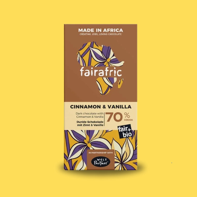 • Fairafric Schokolade Vanille & Zimt: Feinste Bio Schokolade, komplett in Ghana hergestellt, die Arbeitsplätze vor Ort schafft – ein Genuss, der Freude bereitet und Gutes bewirkt.