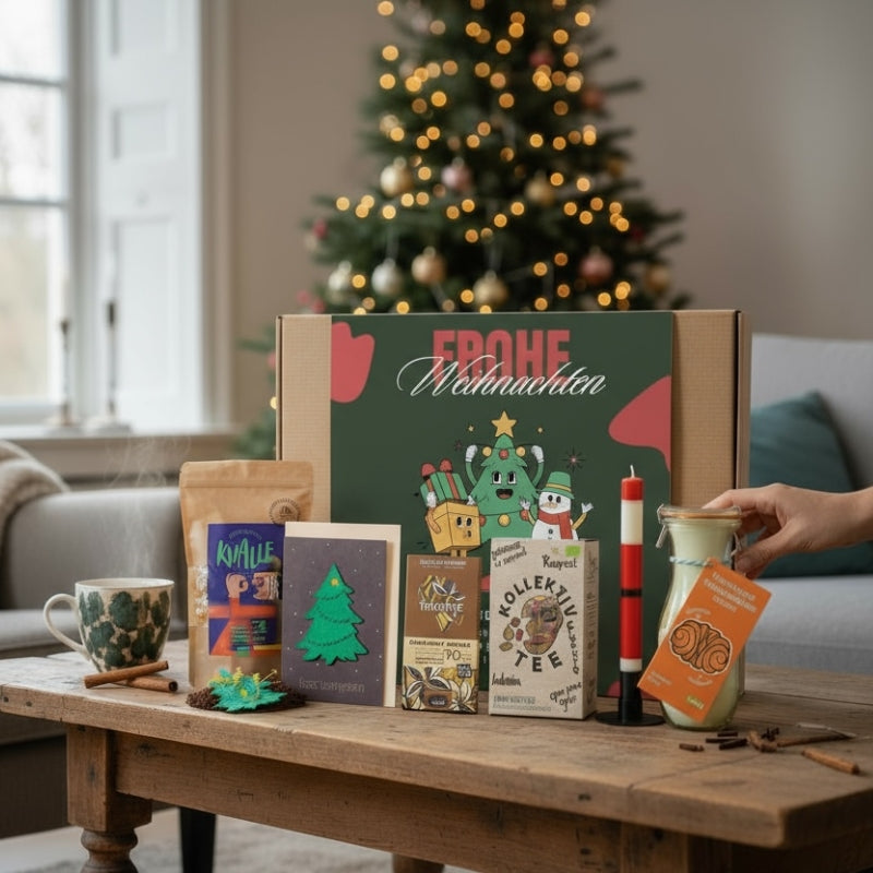 Ob unser Geschenkset „Frohe Weihnachten“ mit liebevoll ausgewählten veganen Produkten, die Hamburger Franzbrötchen Backmischung für gemütliche Backmomente oder das Set „O du Fröhliche“ mit Kerze – jedes Produkt erzählt seine eigene Geschichte. Von der klimaneutralen Verpackung über faire Arbeitsbedingungen bis hin zu sozialen Werkstätten: Hier zählt nicht nur der Genuss, sondern auch der positive Impact.