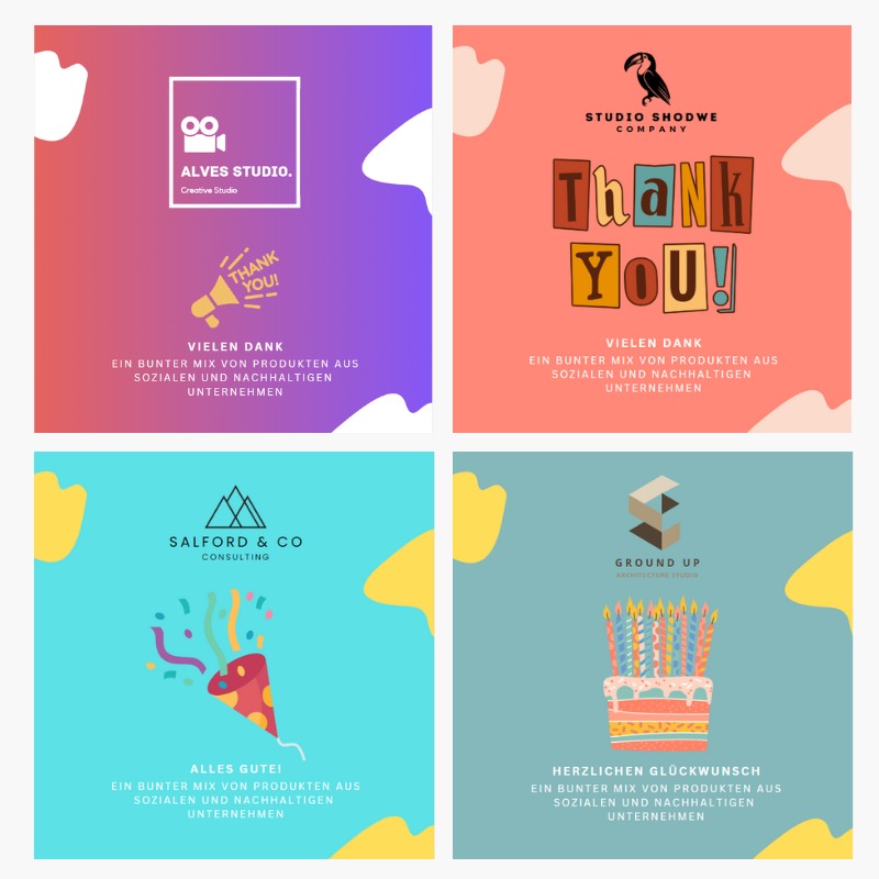 Wir stellen dir eine Auswahl unseres Produktangebots zur Verfügung. Jedes Produkt leistet einen sozialen Mehrwert und wird von Unternehmen aus Deutschland hergestellt. Du hast selbst einen Produktvorschlag? Kein Problem, gern stimmen wir uns zu dem Inhalt individuell mit dir ab.