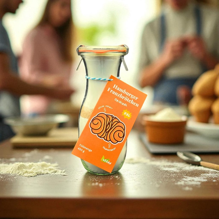 Handgemacht, nachhaltig und mit ganz viel Liebe hergestellt: Unsere XXL Franzbrötchen Backmischung bringt dir den unwiderstehlichen Geschmack Hamburgs in extragroßer Portion direkt nach Hause. Unsere handgemachten Franzbrötchen Backmischungen sind nicht nur lecker, sondern unterstützen auch einen guten Zweck. Neben hochwertigen Bio Zutaten spenden wir pro verkaufter Backmischung 25 Cent an einen guten Zweck.